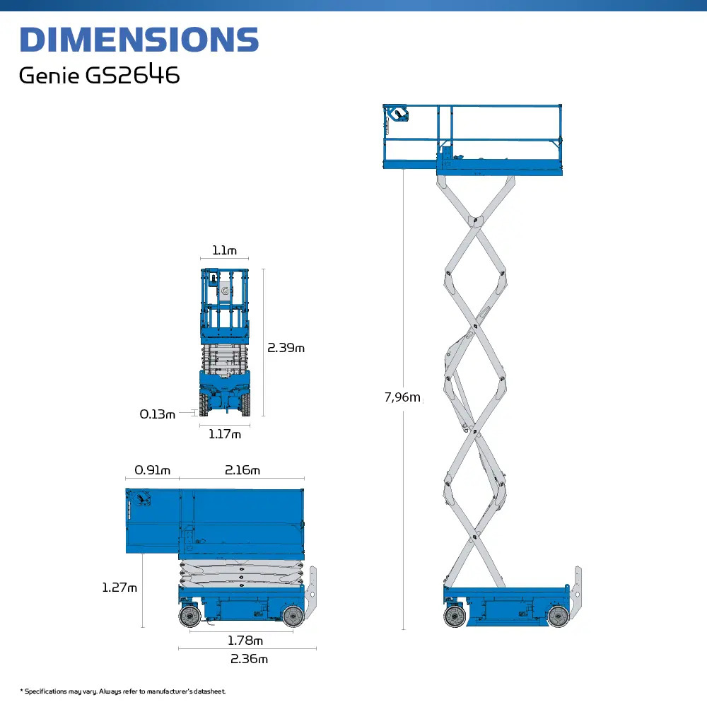 Xe nâng người cắt kéo Genie GS-2646 là dòng thiết bị nâng hạ chạy điện, được thiết kế chuyên dụng cho các công việc trên cao trong nhà xưởng, nhà thép tiền chế, công trình thương mại và công nghiệp. Với khả năng nâng ổn định, bề mặt sàn rộng và tải trọng lớn, GS-2646 được nhiều đơn vị tin dùng nhờ sự an toàn, tiết kiệm chi phí và thân thiện môi trường.